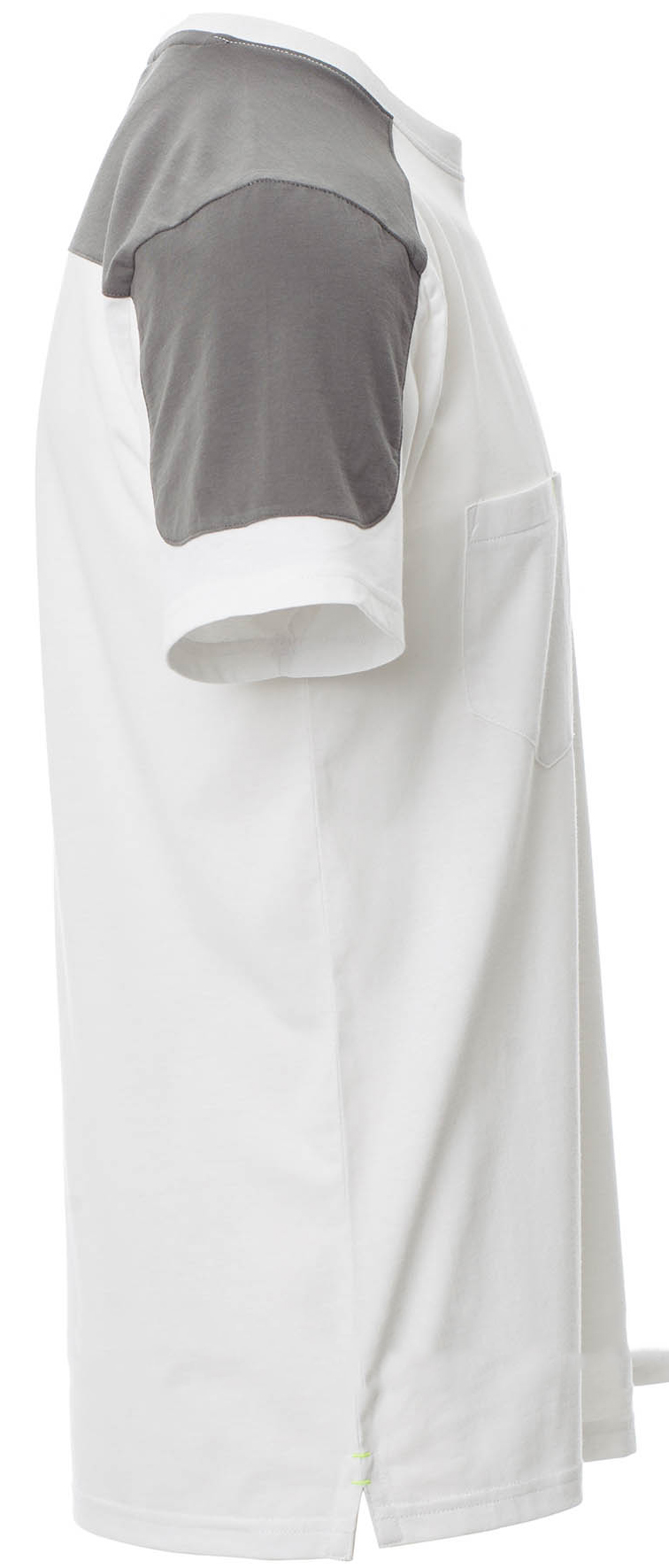 T-shirt bicolore, taschino al petto con porta penna, cuciture del collo coperte e nastro di rinforzo laterale.