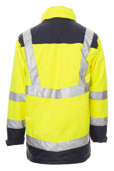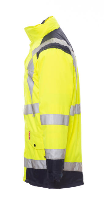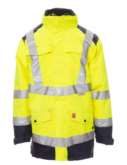 Parka bicolore 4in1 in alta visibilità con bande riflettenti. Giacca esterna sfoderata, apertura con zip in plastica con cursore in metallo coperta da patta e velcro, cappuccio con coulisse staccabile e/o richiudibile nel colletto, polsini regolabili elasticizzati. 4 tasche frontali: petto destro con velcro, porta penne e porta badge a scomparsa; lato cuore con zip; 2 inferiori con zip e bottone a pressione e apertura laterale. Cuciture termonastrate. Giubbotto interno imbottito con maniche staccabili, zip in plastica con cursore in metallo, polsino elasticizzato. 4 tasche frontali: petto sinistro con velcro, porta penne e porta badge a scomparsa; lato cuore con zip; 2 inferiori con velcro. Su entrambi: colletto e spalle in micropile, zip per agevolare stampe e ricami, due bande su torace, spalle e maniche.