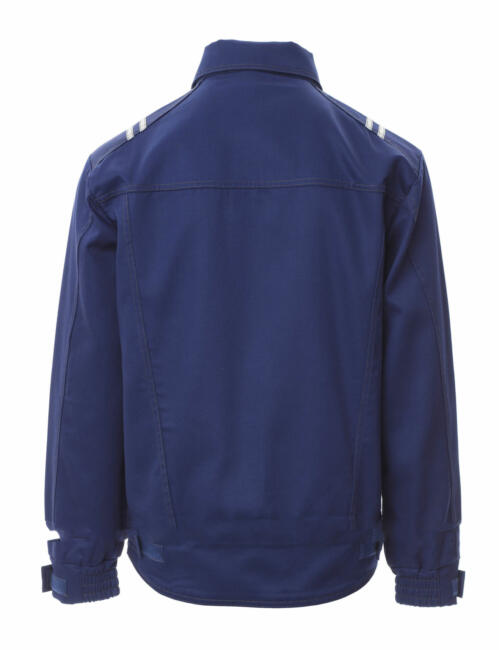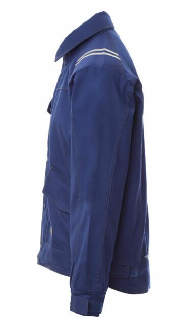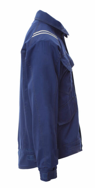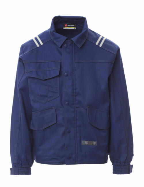 Giubbotto tipo jeans in cotone antistatico, antiacido, ignifugo, resistente all’arco elettrico ed adatto ai saldatori, doppie cuciture in contrasto e rinforzate su maniche, fianco e dietro. Due tasconi in vita e un taschino petto parte destra con porta penna tutti coperti da patta fermata con velcro. Fondo dietro sagomato per una migliore copertura e regolabile da velcro, maniche a giro con polsino elastico e alamaro con velcro per ulteriore regolazione. Zip davanti coperta da patta con bottoni a pressione. Bande 3M retroriflettenti applicate sulle spalle e nel fondo dietro. Portabadge in plastica staccabile.