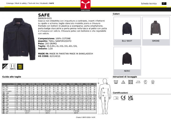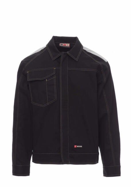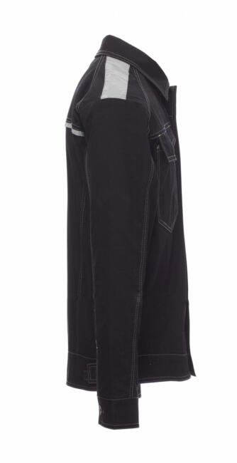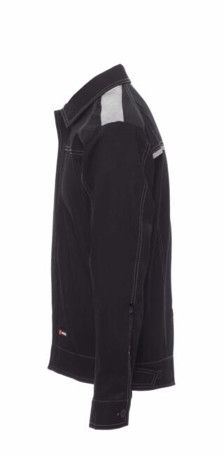 Giacca non imbottita con impunture a contrasto, inserti riflettenti su spalle e schiena; taglio slanciato modello jeans e chiusura frontale con bottoni in plastica a scomparsa; porta smartphone, porta badge staccabile e porta penna nella tasca al petto con patta e chiusura con velcro. Chiusura polso con bottone e vita regolabile con velcro.