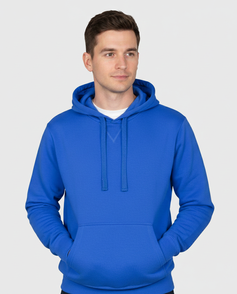 Felpa da uomo, cappuccio con coulisse in tinta, cucitura estetica a V al collo, tasche a marsupio, manica a giro, polsini e vita in costina elasticizzata, cuciture rinforzate. Nastro di rinforzo interno collo in tinta.