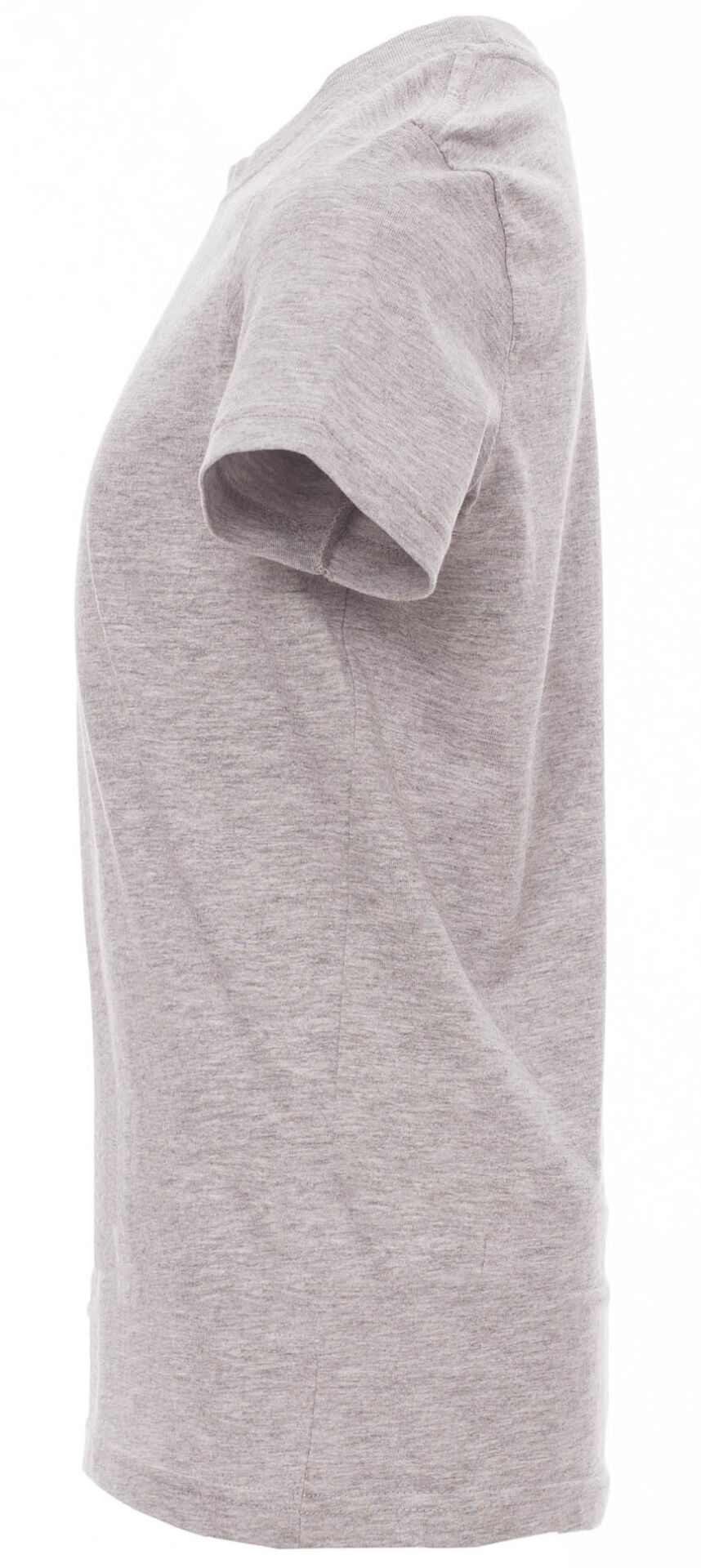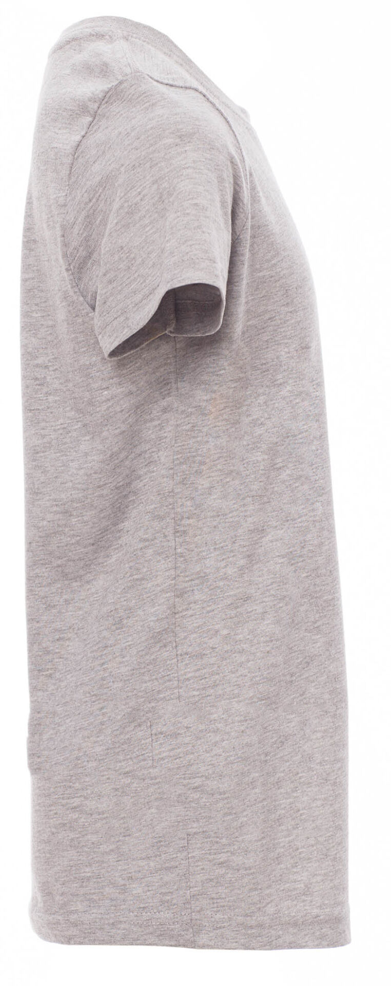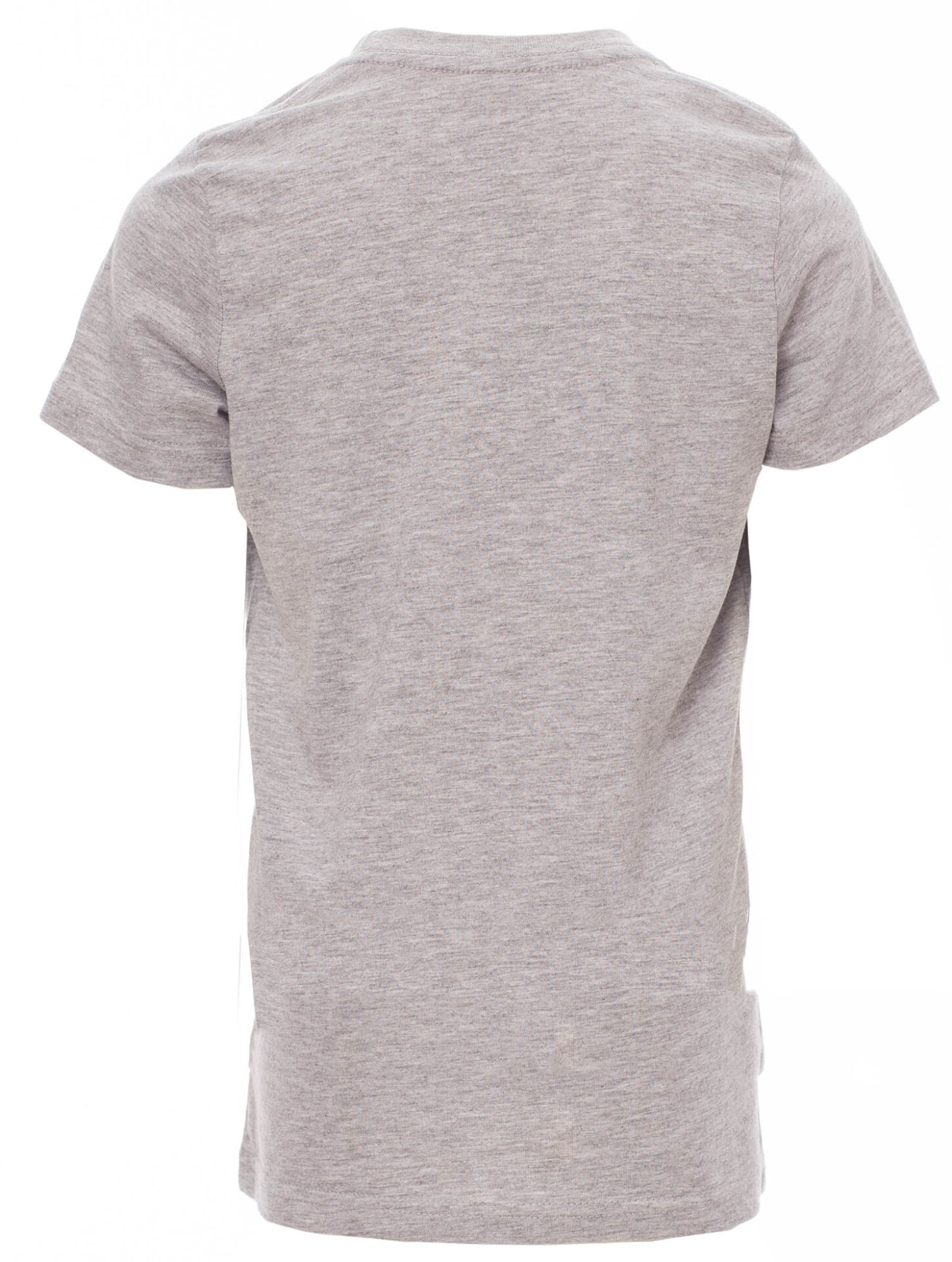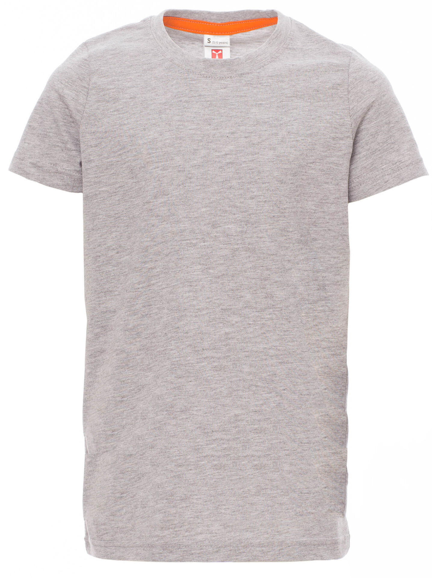T-shirt da bimbo girocollo manica corta, colletto in costina misto spandex da 1.5 cm con cucitura ribattuta sul davanti, nastro di rinforzo da spalla a spalla in colore a contrasto visibile nel colletto, cuciture stretch, cucita lateralmente